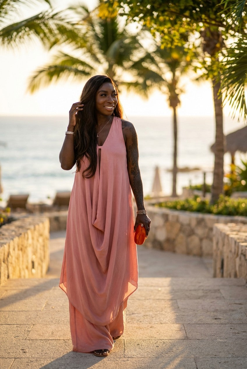 Style this ensemble with minimalist metallic sandals and a statement clutch for a refined evening event or a chic gallery opening.